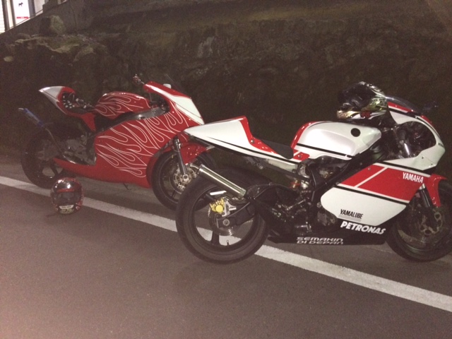 暗いし逆光だしよくわからん。2気筒4st組の私とモンチのマシン。