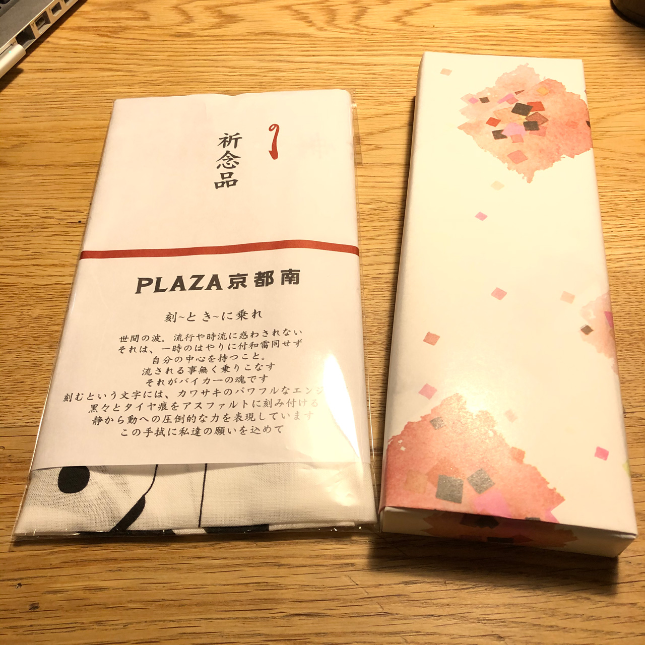 アンケートに答えて、前にプラザ五条でもらった瓦せんべいと一緒に刻(とき)に乗れ日本手拭をもらいました。なにげに手ぬぐいは嬉しい。