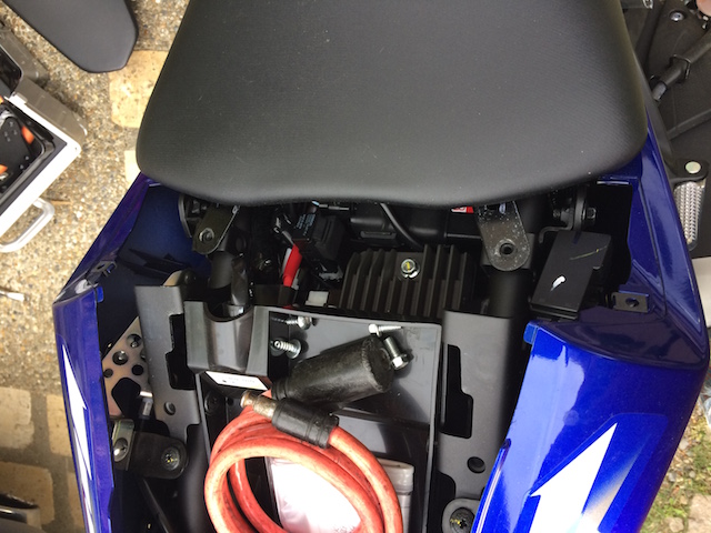 タンデムシートを外して、タンデムシート下のカウルを外します。前のシートは8ミリのボルト2本で止まっているのでそれも外します。