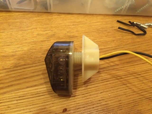ウインカーはかなりコンパクトです。ウィンカー本体にプラスチックのボルトが付いていて、裏からプラスチックのナットを締めて車体に挟み込むだけの簡単仕様。