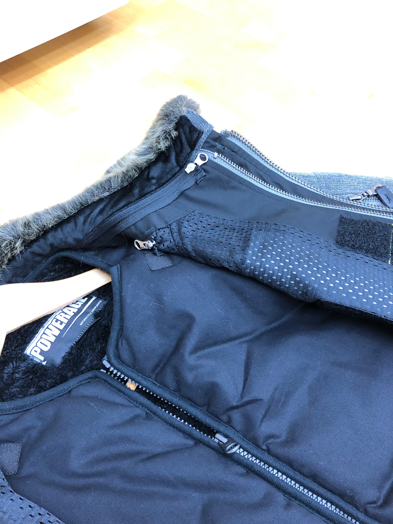 ジッパーはインナーに1つ、アウターに2重になっているので、多少の雨は防御できそう。もちろん風の侵入も防いでくれる。