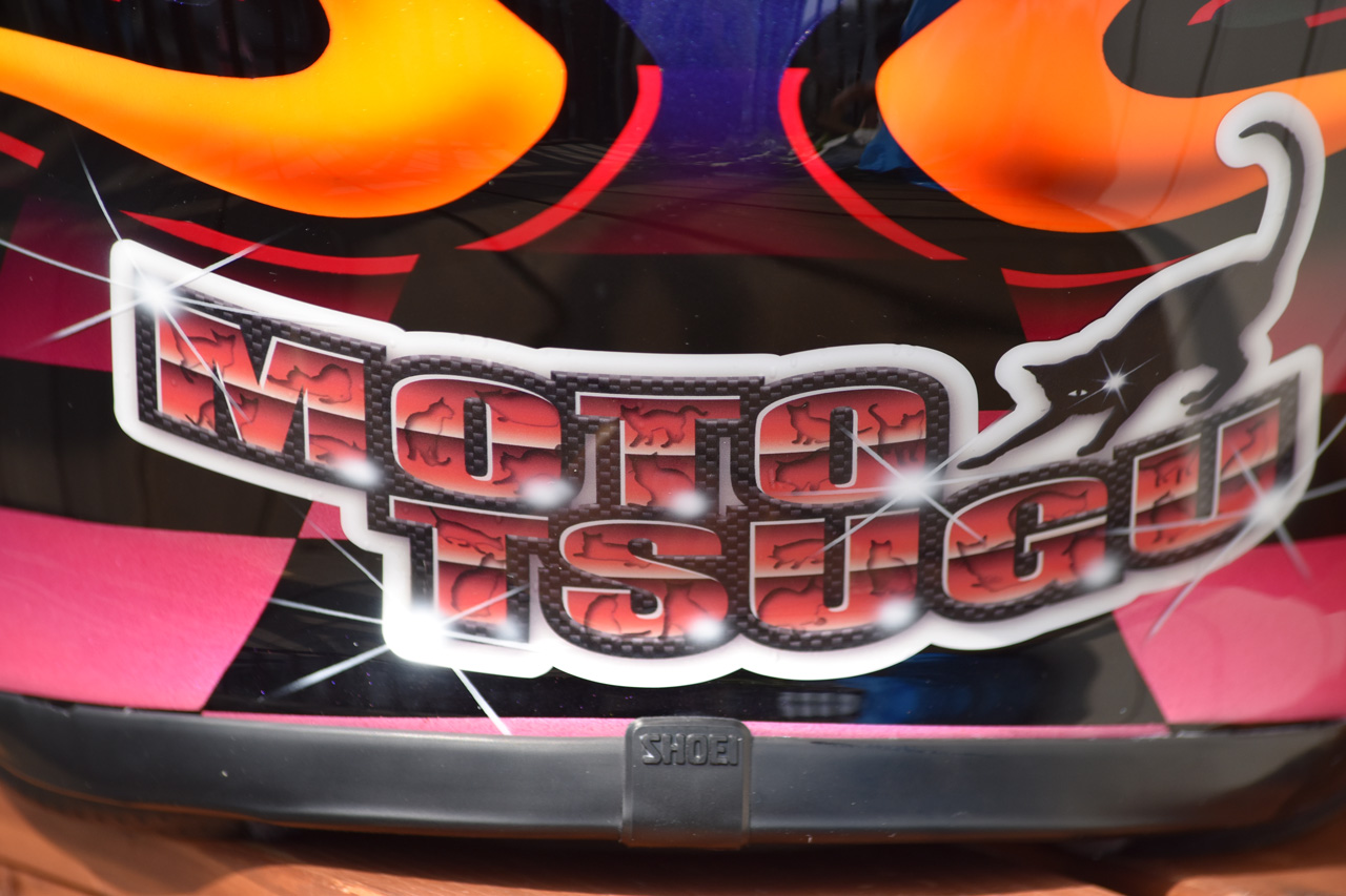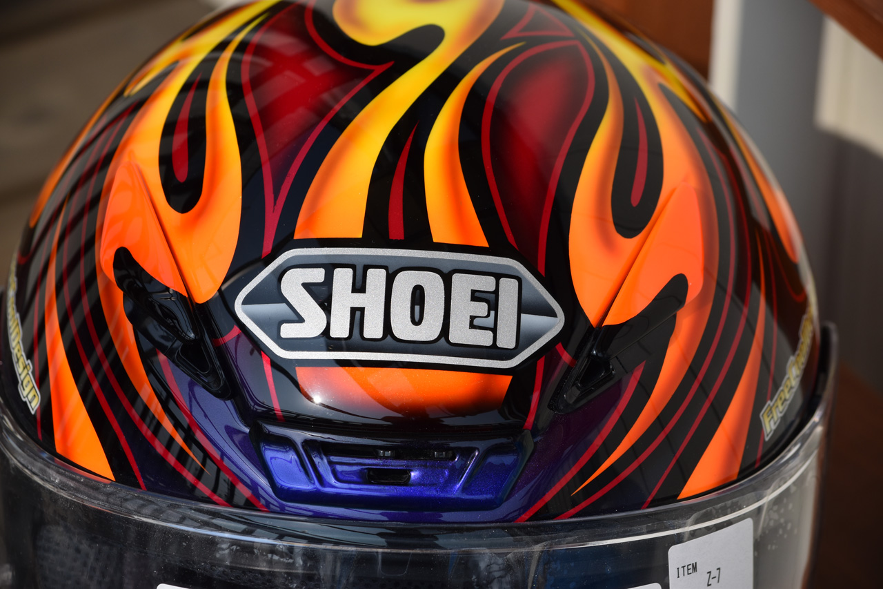 SHOEIのロゴは塗ってあるみたいです。ステッカーじゃ味気ないけど、全体のイメージに合わせてロゴもペイントするとグッと雰囲気が締まります。