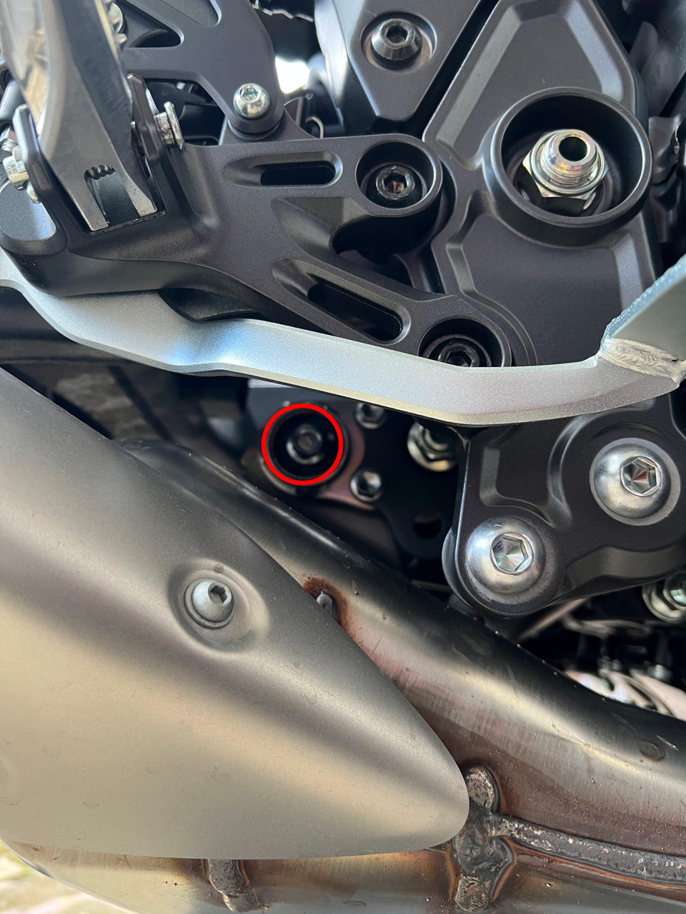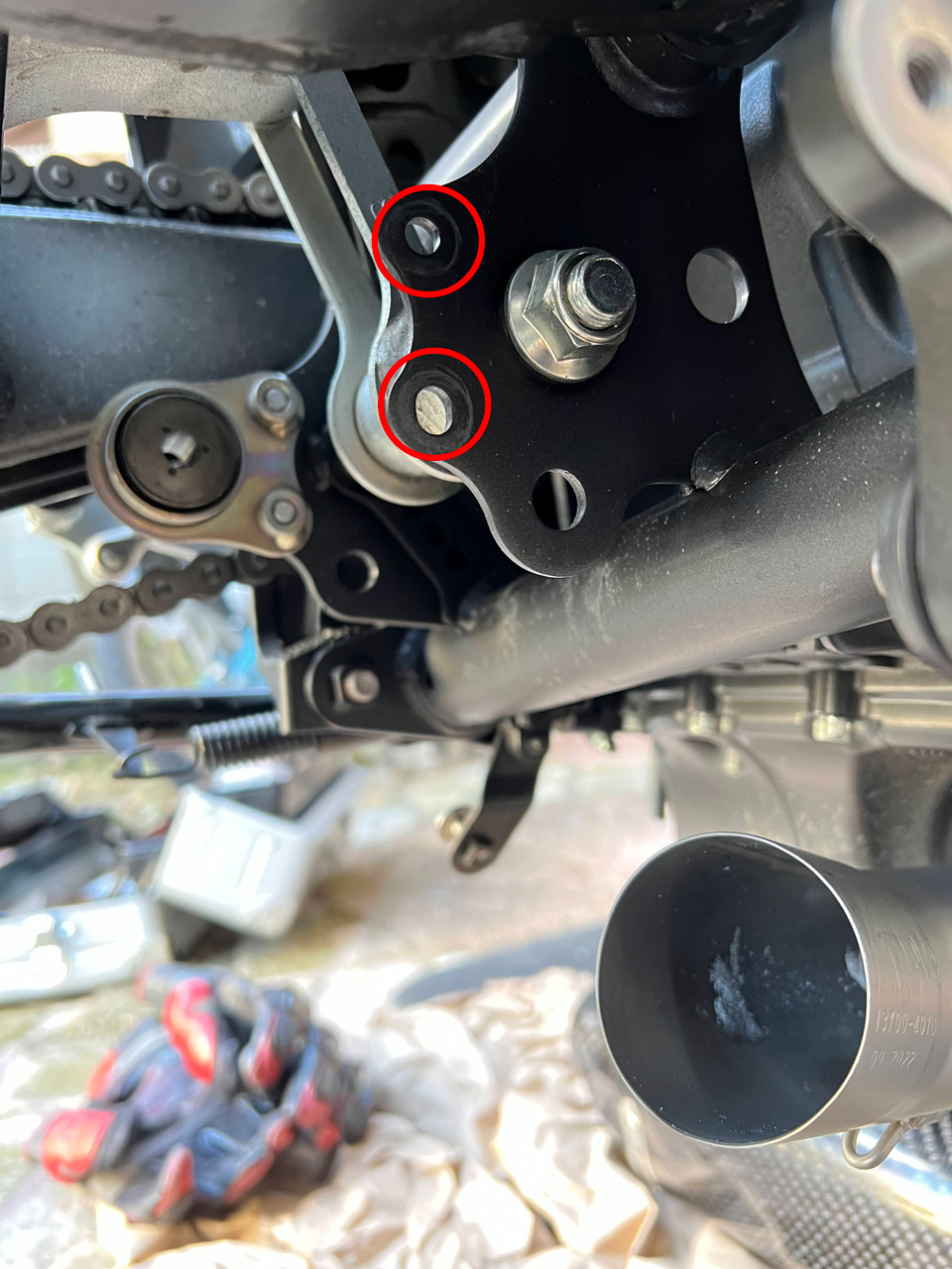 赤丸の部分がノーマルブラケットが付いてた場所。同じ場所にヨシムラのブラケットを取り付ける。