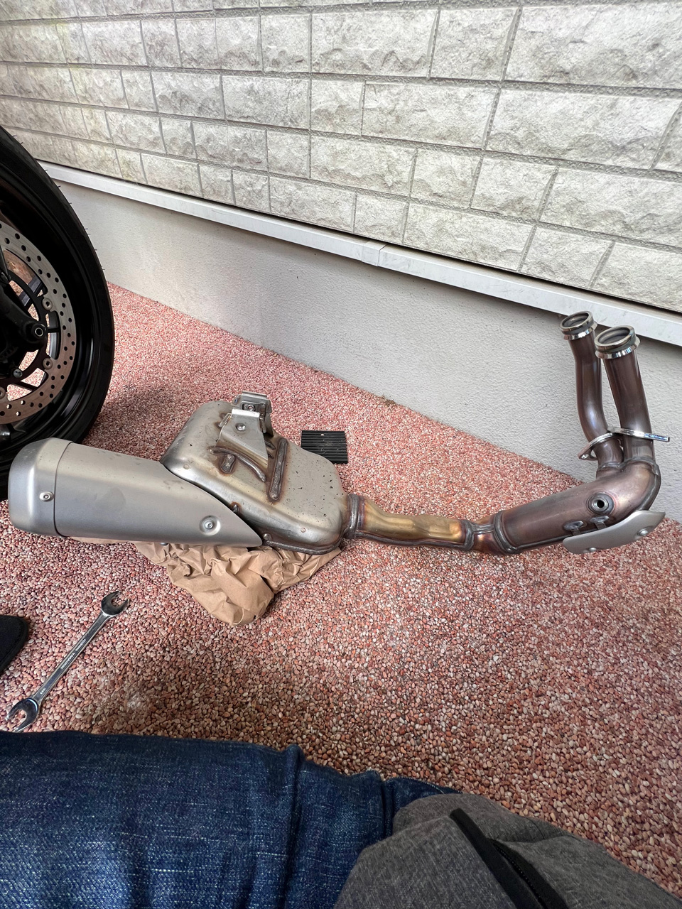 ノーマルマフラーを吊り下げているボルトを外すとマフラーが外れてしまうので、足などで支えながら吊り下げボルトを外してください。ノーマルは重いので支えておかないとフランジのボルトに負荷が掛かりいらぬトラブルの元になってしまいます。