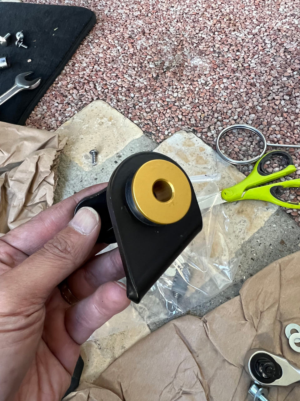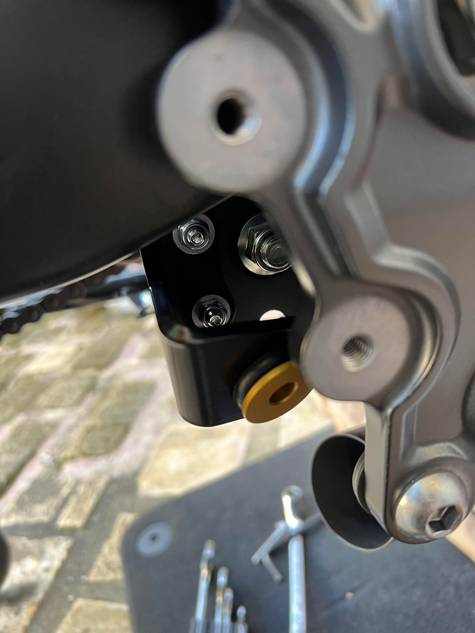 ノーマルのマフラー吊り下げブラケットを外して、ヨシムラ付属の専用ブラケットに交換する。
