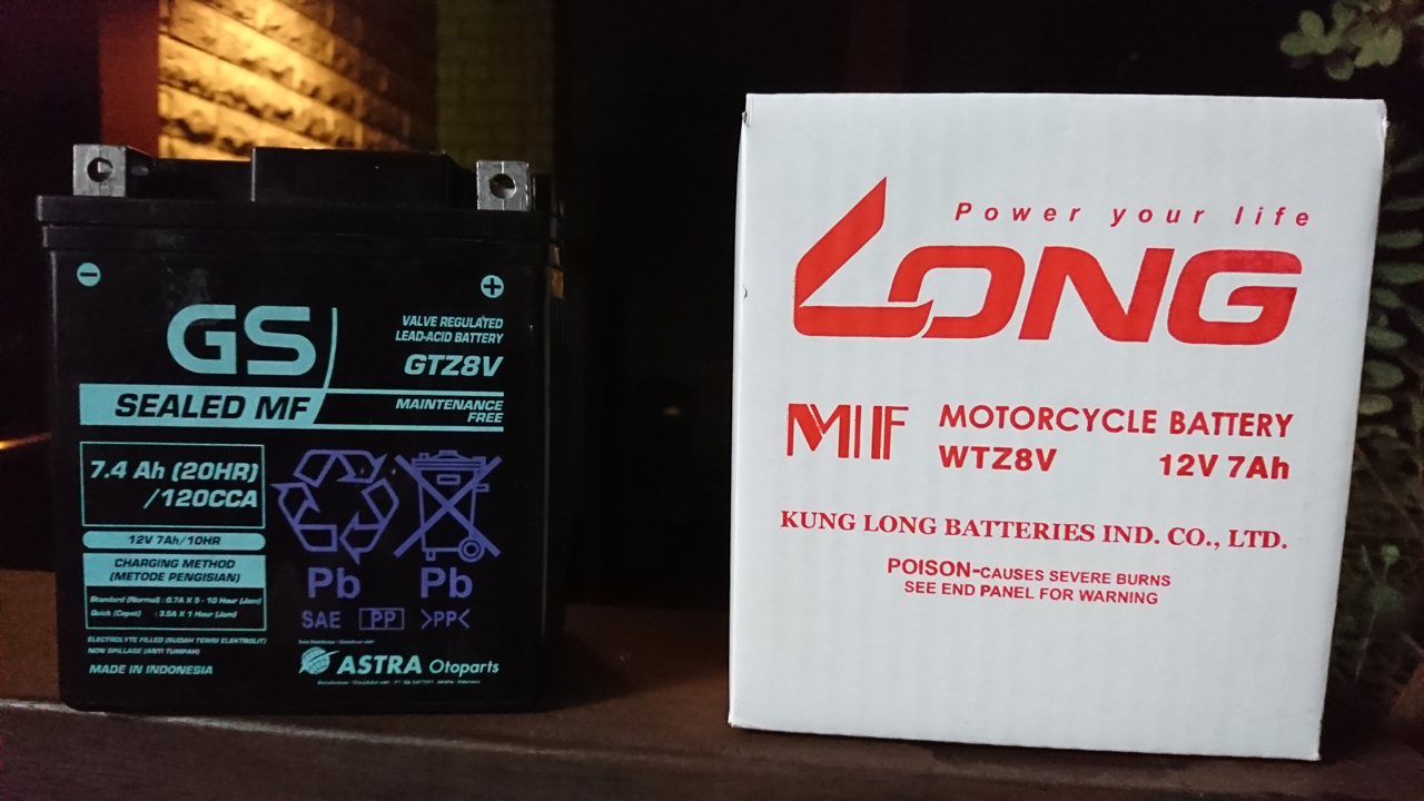 純正でついていたのでGS YUASAのバッテリーで、買ったのは台湾製のLONGってバッテリー。YUASAは20,000円に対してLONGは7,000円、台湾YMAHAってのもあるくらいなんだし、台湾ではレースも盛んだから多分大丈夫だろ。