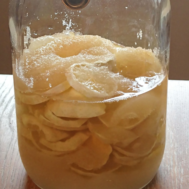 この保存瓶は子どもでも飲めるかもしれんと思い、皮をむいてありますが、大人用は