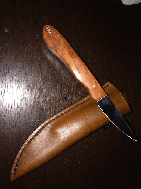 後はレザークラフトでシースを作るだけだったのですが、ショップの方にあまりシースを頂く事ができました。違うナイフのシースとして仕上げたものですが、ナイフだけ売れてシースは残ってしまったそうです。
