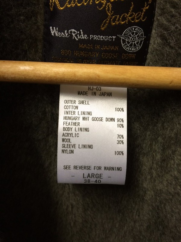WESTRIDEのRACING DOWN JACKET TYPE3です。カラーはオリーブでサイズはLです。試着した時から暖かさが半端じゃない事はわかりました。
