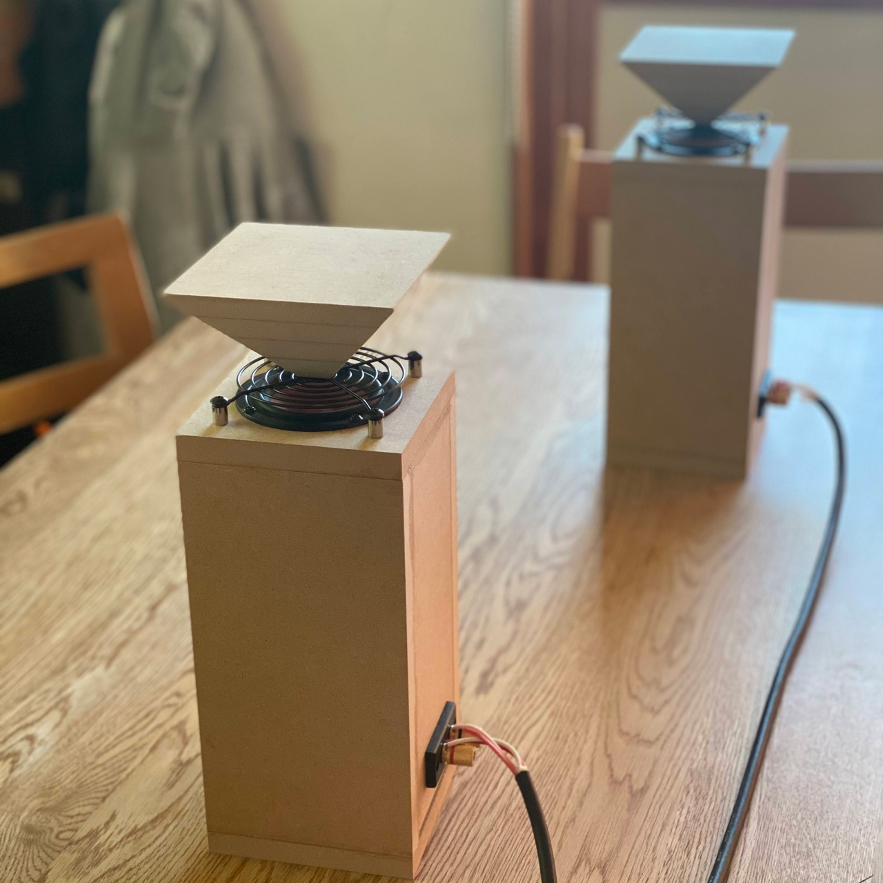 BGMにそれほど投資できないし、ブックシェルフのスピーカーを適当に置くのも勿体ないので、無指向性スピーカーKITを使って自作。てっぺんに付いている逆ピラミッドに音が当たって拡散する仕様。何気なく使いましたが、かなり良いアイテムでしたよ。
