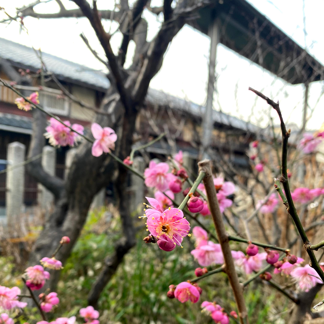 向かいの神社に梅が咲き始める