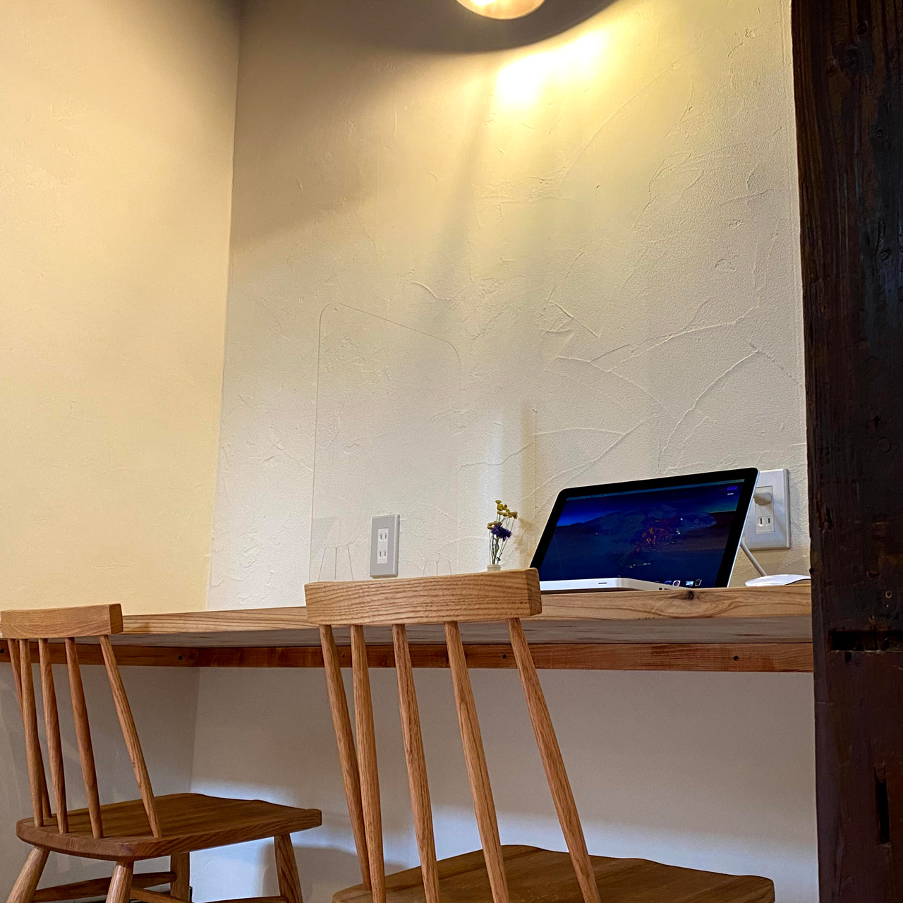 コロナ禍でお一人でPC作業をされるお客様が多いので、一人用のお席を追加しました。コンセントが無いので延長コードを引っ張って机のサイドに取り付け。