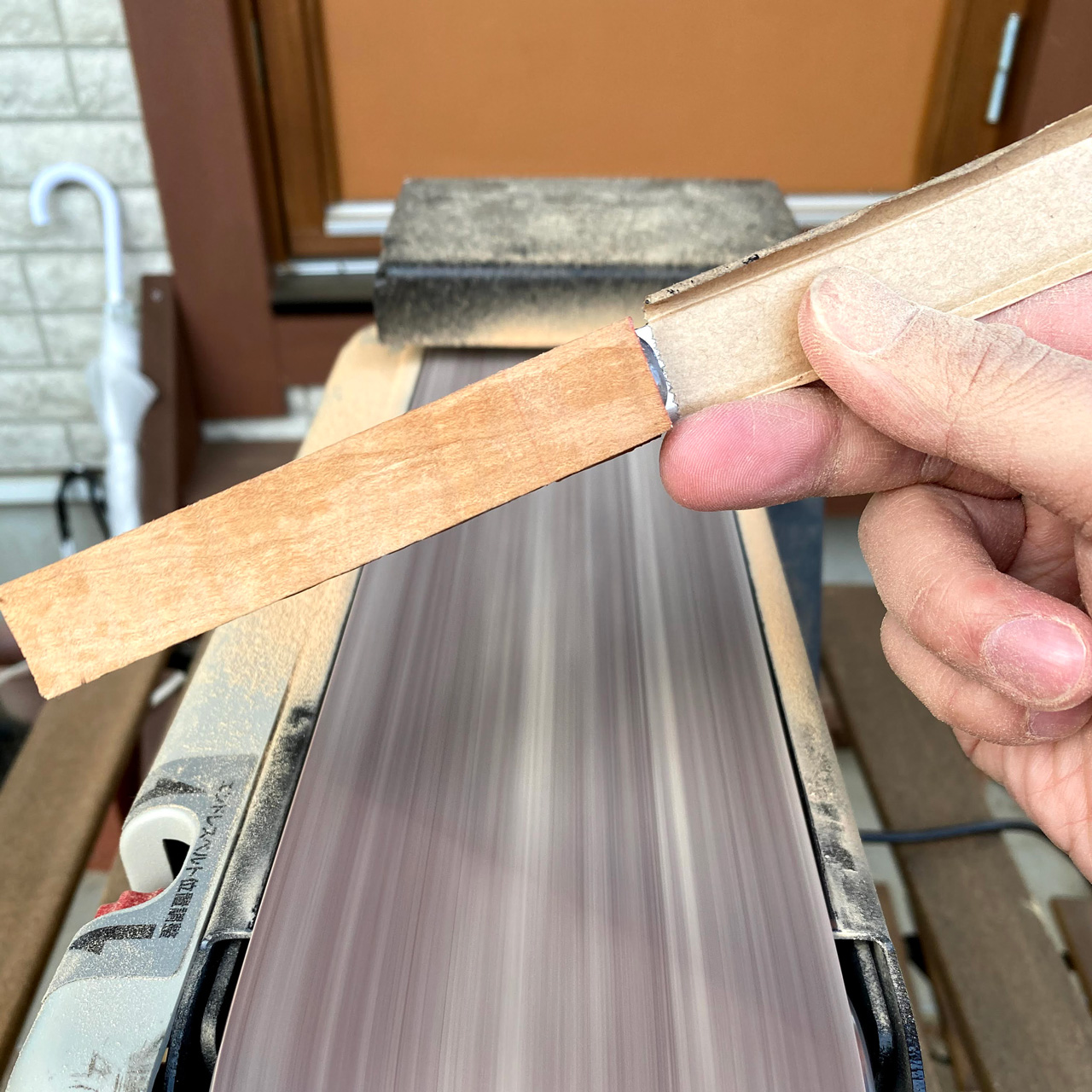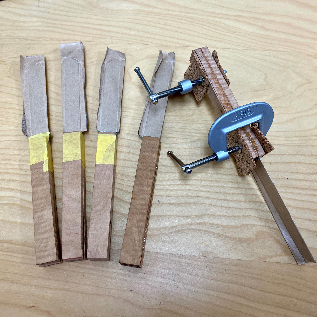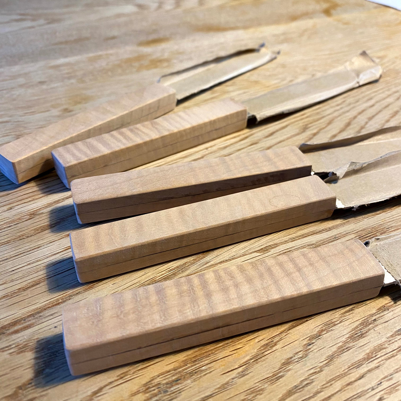 放置していたお店のテーブルナイフにハンドルを取り付けました。タイガーパターンのメイプル材を張り合わせ、削り出して厚さを調整しました。