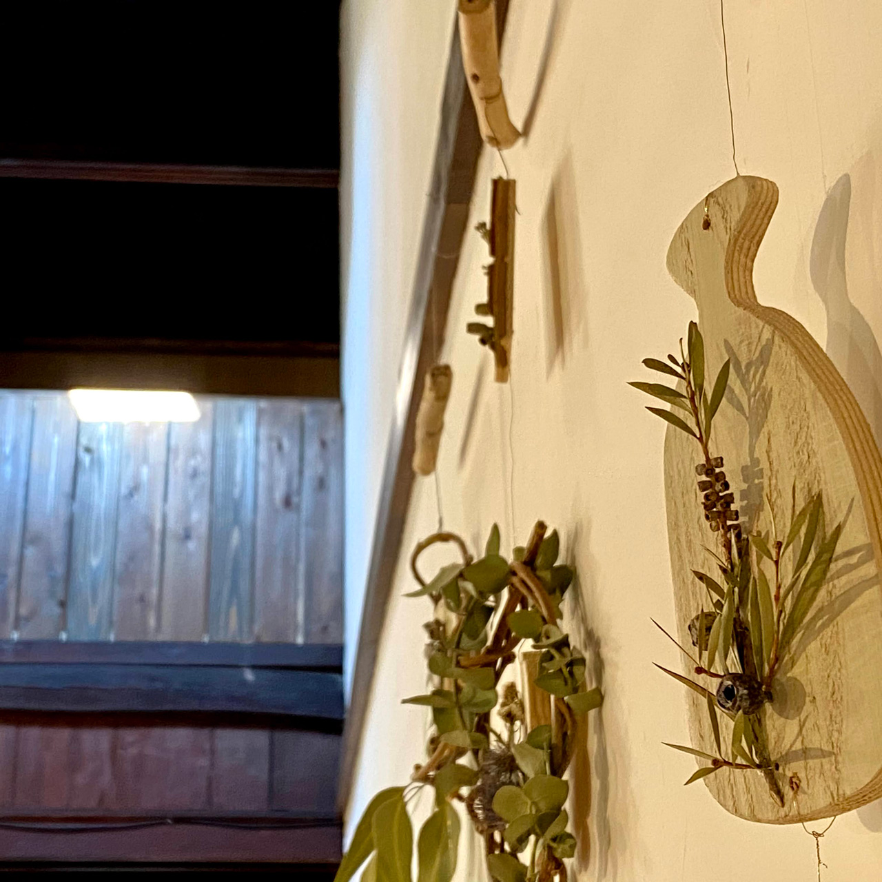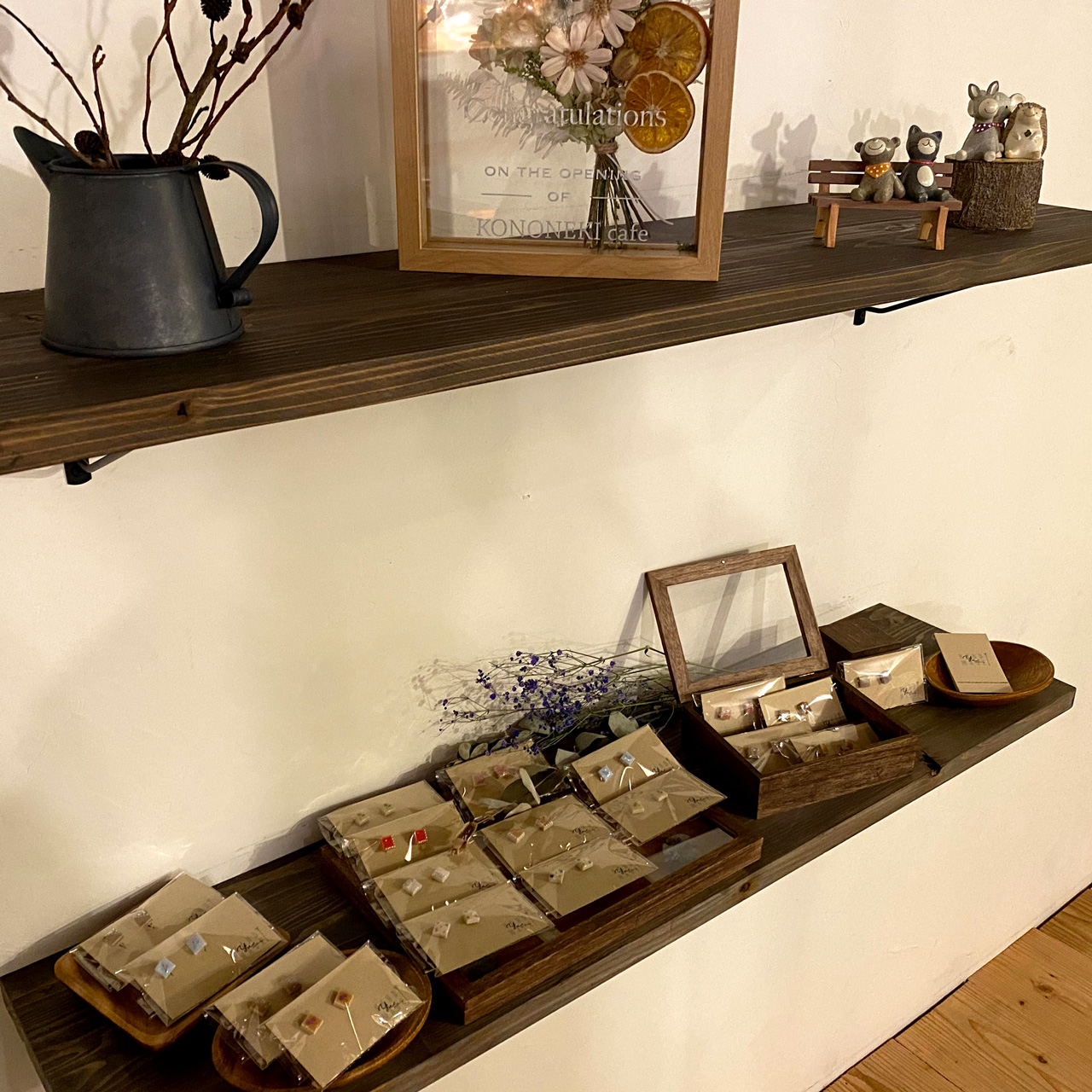 花屋にちさんにお店の壁に飾るドライフラワーを用意していただきました。木で作った土台にドライフラワーをアレンジしていただいて良い感じで壁を飾っていただけました。