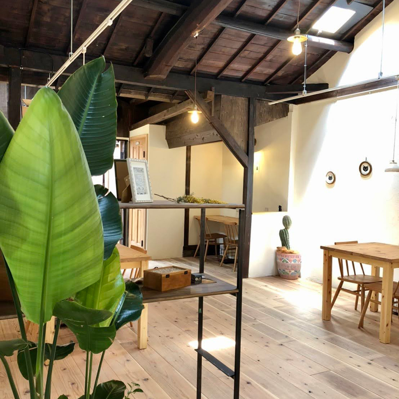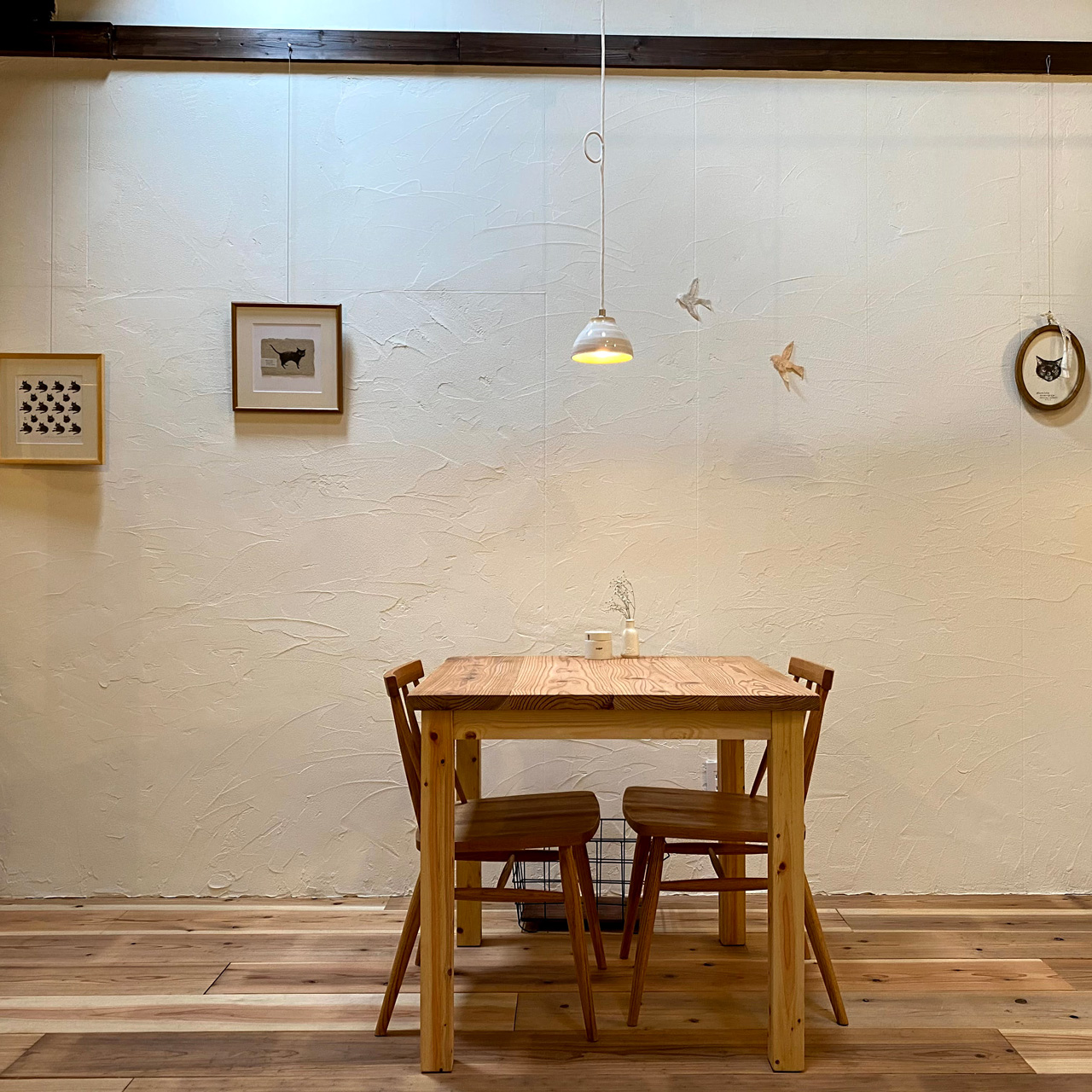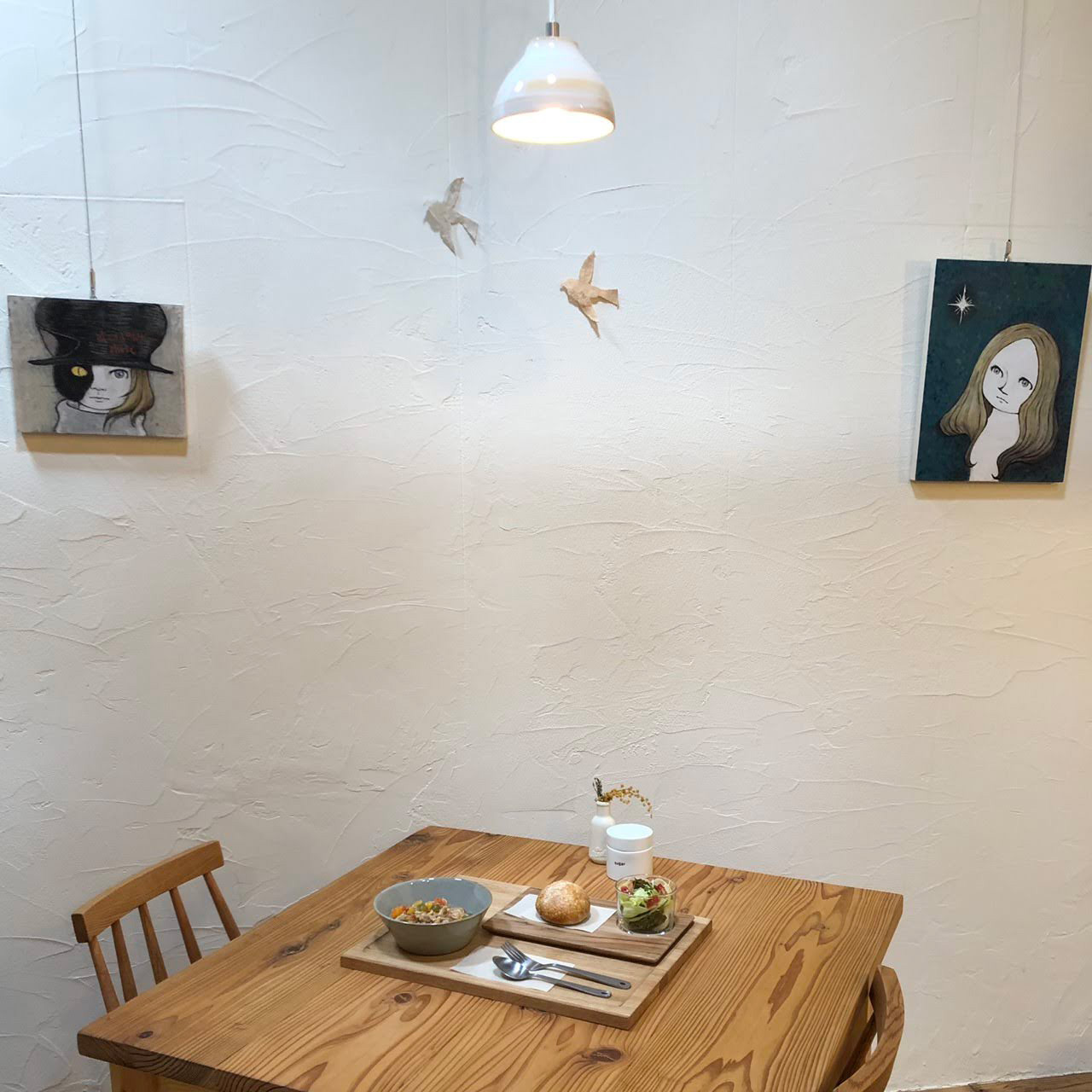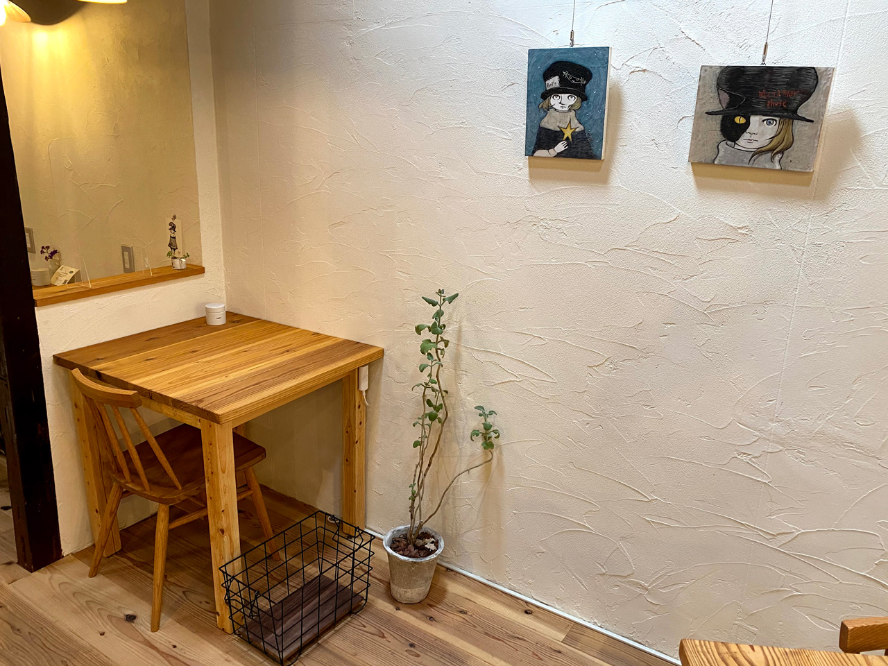 手つかずだった小物類の備品も少しずつ揃い出し、そんな中、お店の近所でアトリエをされているALFREDさんより絵画をレンタルしていただけることに。少し殺風景だった漆喰の壁に絵画がかかりました。毎月絵を入れ換えていただけるので本当に助かりました。