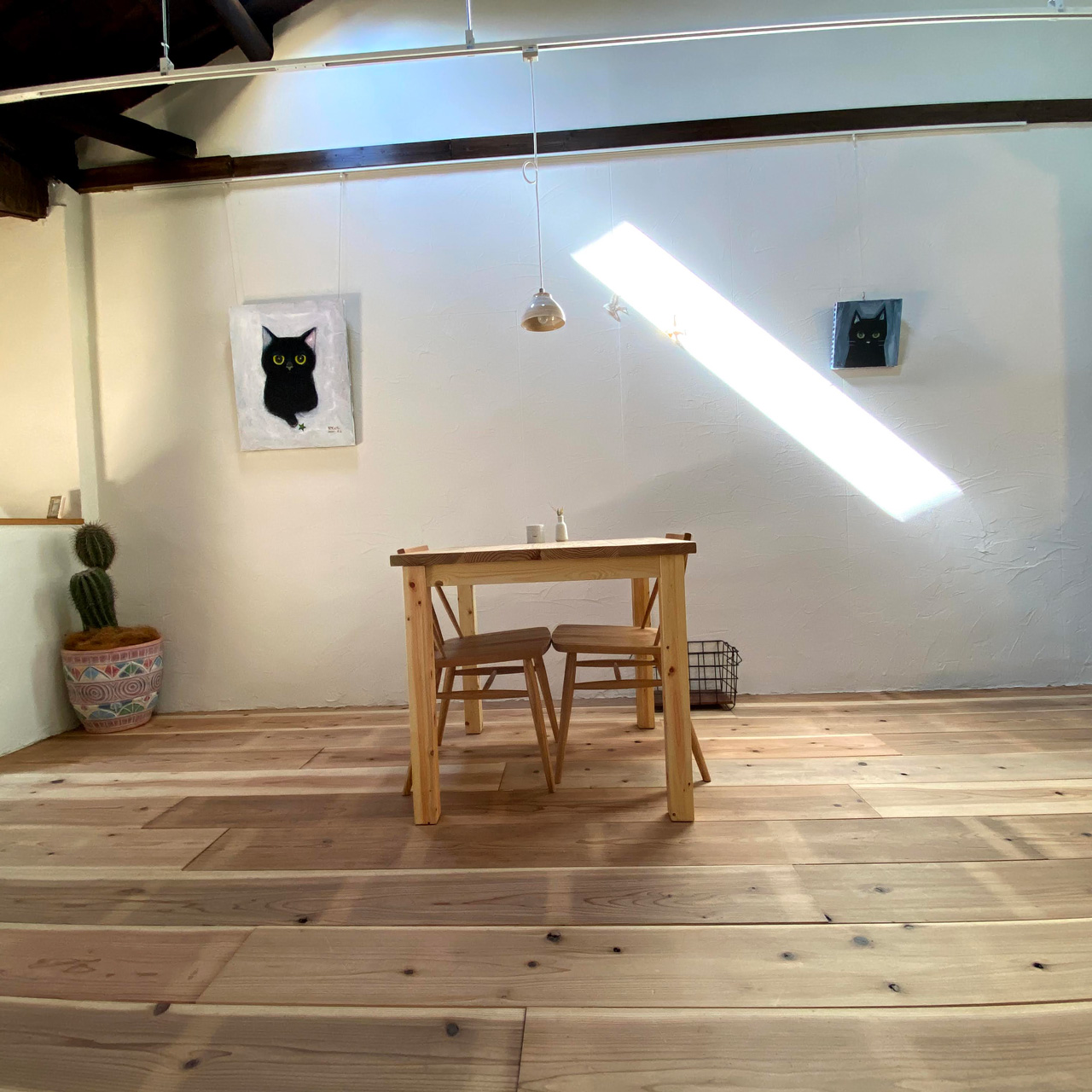 ピクチャーレールを設置して絵画を吊りました。狙ったわけでもなくALFREDさんには黒猫の絵が多いんです。