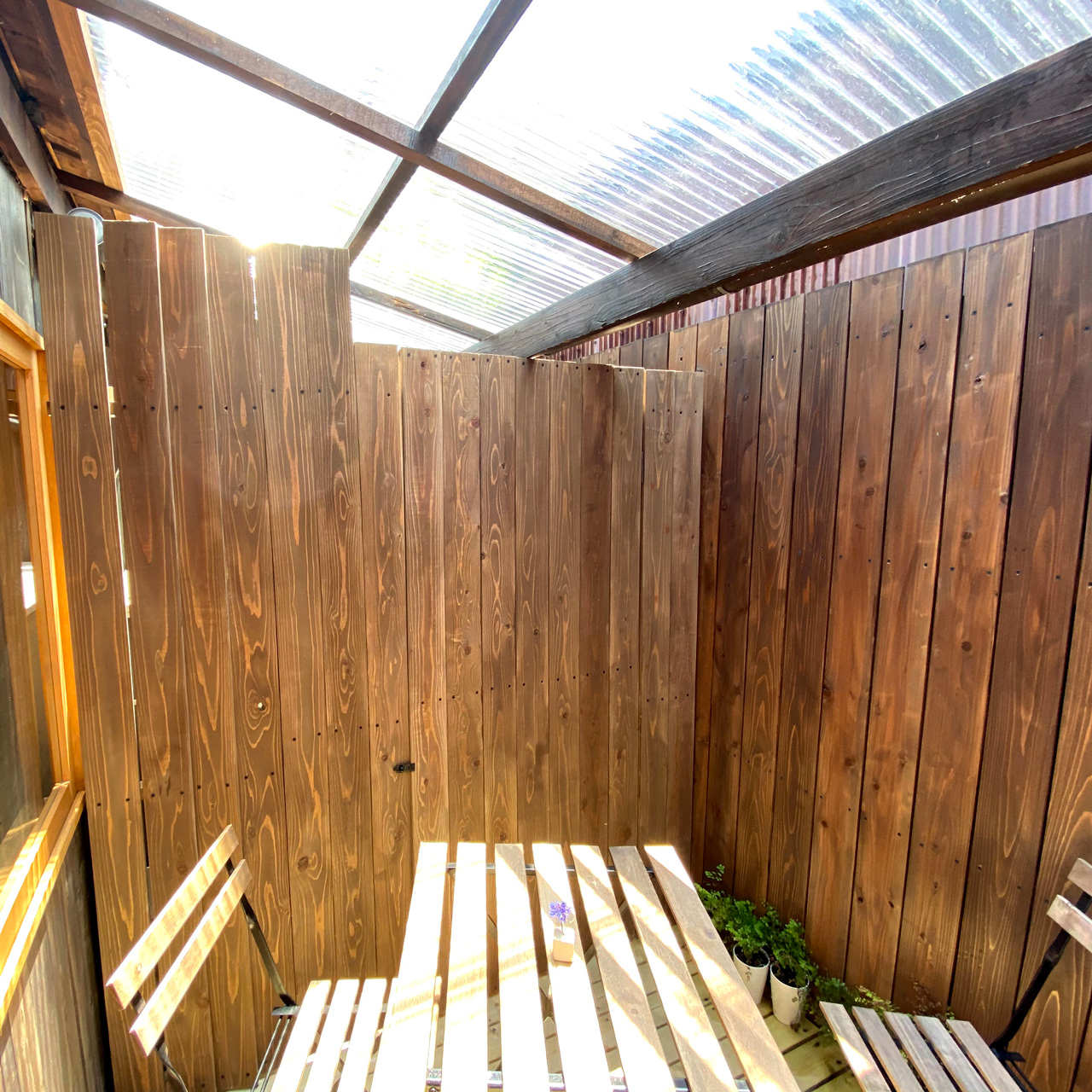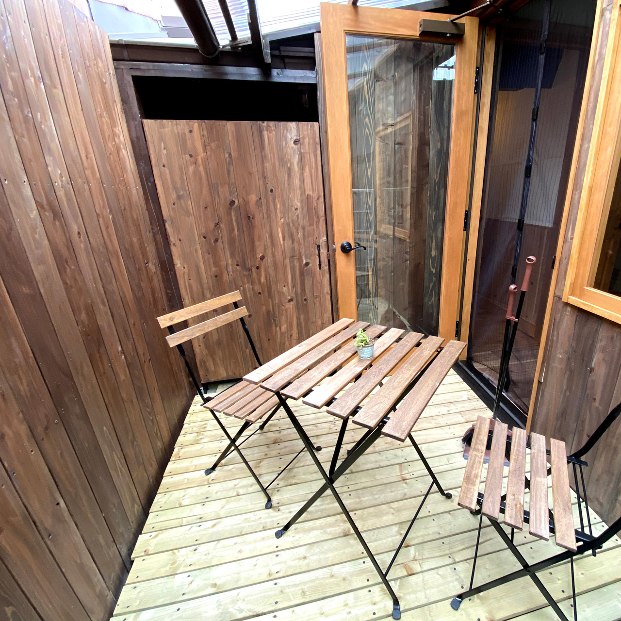 気候が良くなったのでテラスの利用の声がちらほら。家にあったIKEAのガーデンテーブルセットを持って行きました。