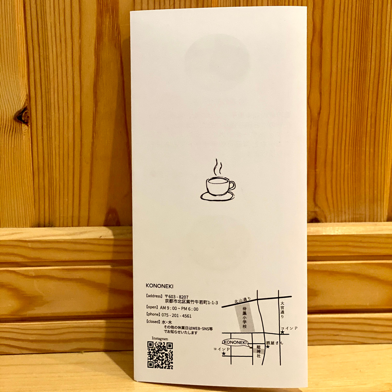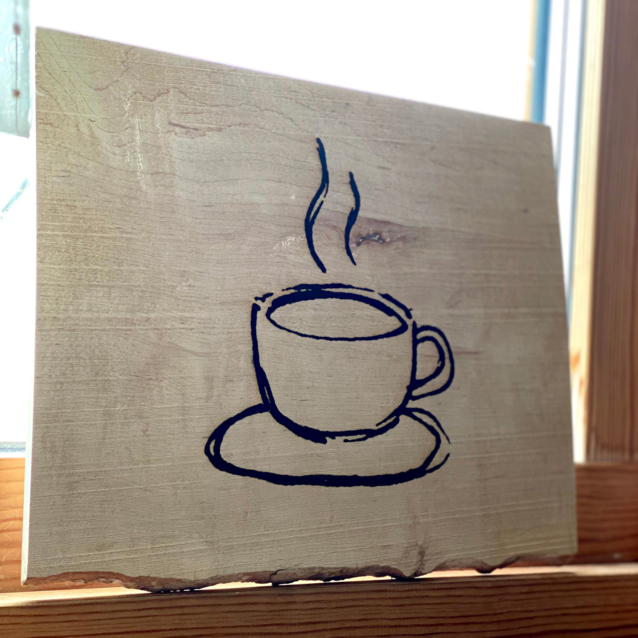 トチの木の板材に、コーヒーカップをレーザーで彫刻しました。近所の家具屋さんで端材を譲っていただけたので味わいのある木を手に入れることができた。ホームセンターで用意したリングとチェーンでお店の軒先に吊るしました。シンプルだけど味のあるこういったアイテムが大好きです。