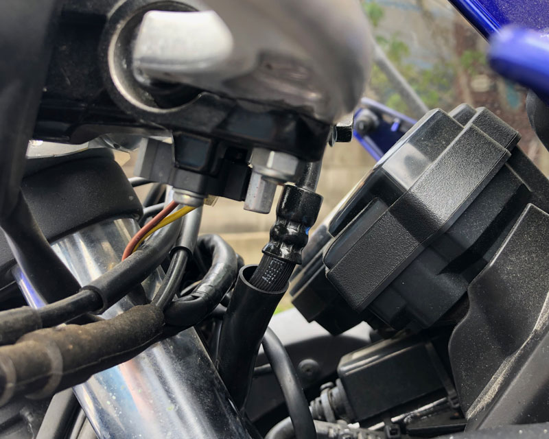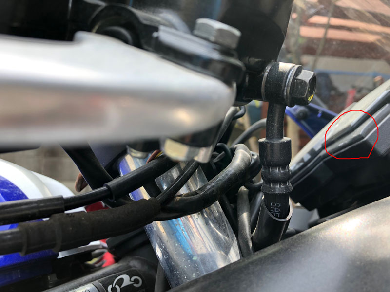解決するには 1.メーターを移動する 2.外側に向かって角度のあるバンジョーの向きを内側に変える 3.純正ハンドルの高さに戻す このあたりが考えられますが、私はいずれバンジョーの向きを変えようと思っていました。