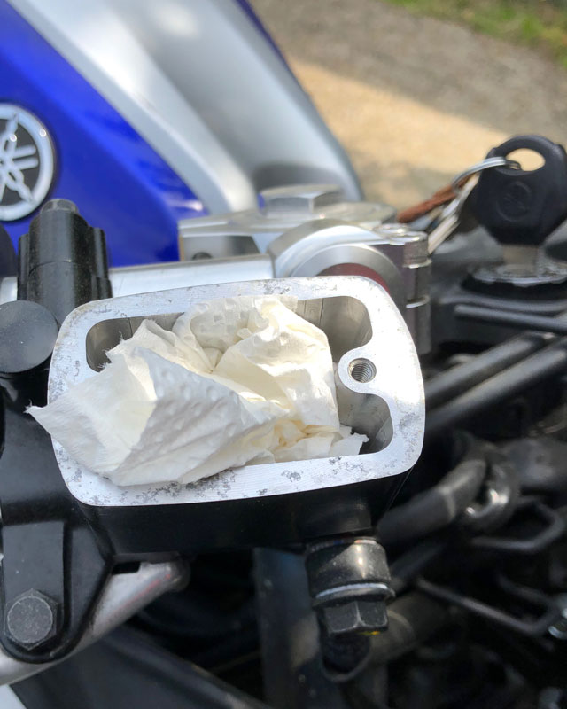 とりあえずリザーブタンク内のフルードをキッチンタオルで吸い取ります。