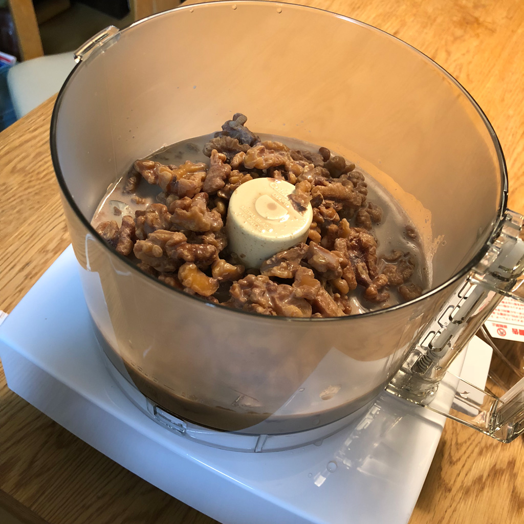本来はヘーゼルナッツが原材料の様ですが、今回はパン用に買ったクルミがかなり残っていたので、クルミを利用することにした。
