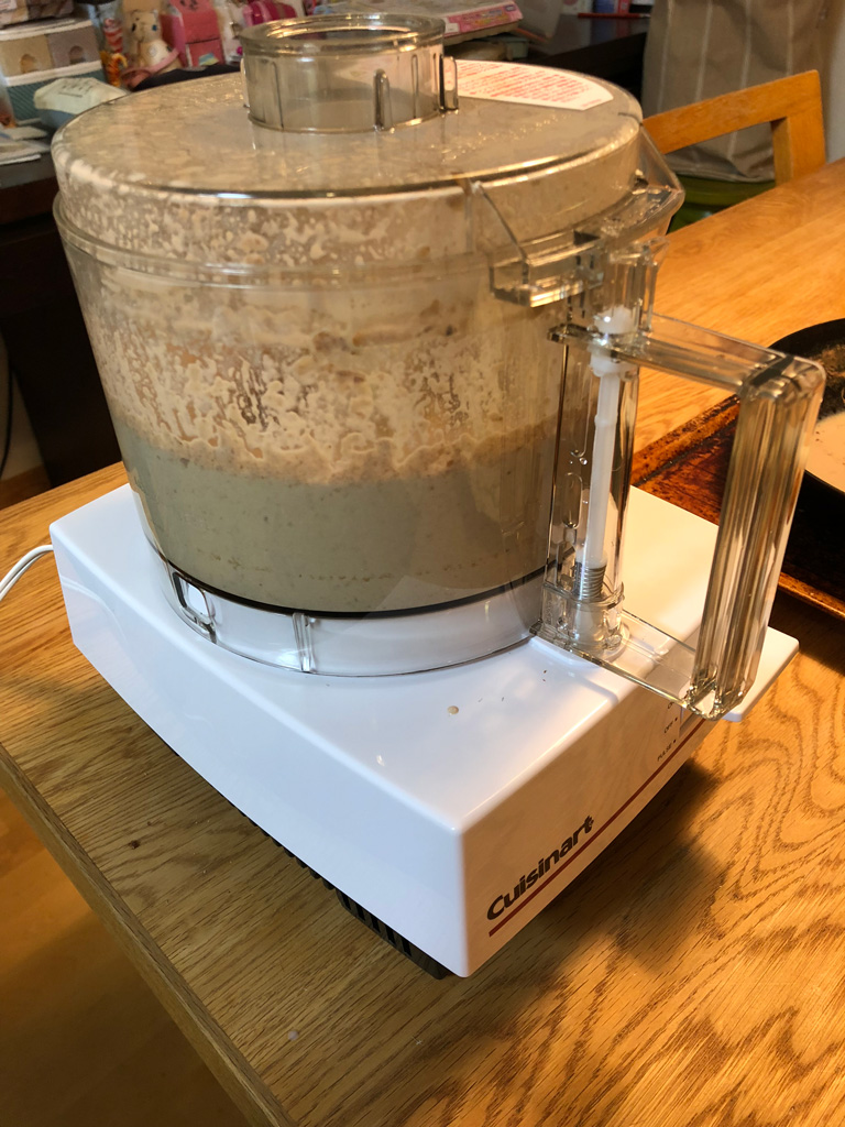 粗熱をとった後(完全に冷ましません)こっからフードプロセッサーの出番。パルスで軽く撹拌し、ONにして一気にペースト状になるまで回します!