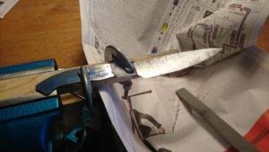 板ヤスリを刃先の部分に45度の角度で当て、両側から均等に削り2ミリの厚さを0.5ミリまで削りました。2ミリ厚のセンターはショップの方にケガいてもらいました。