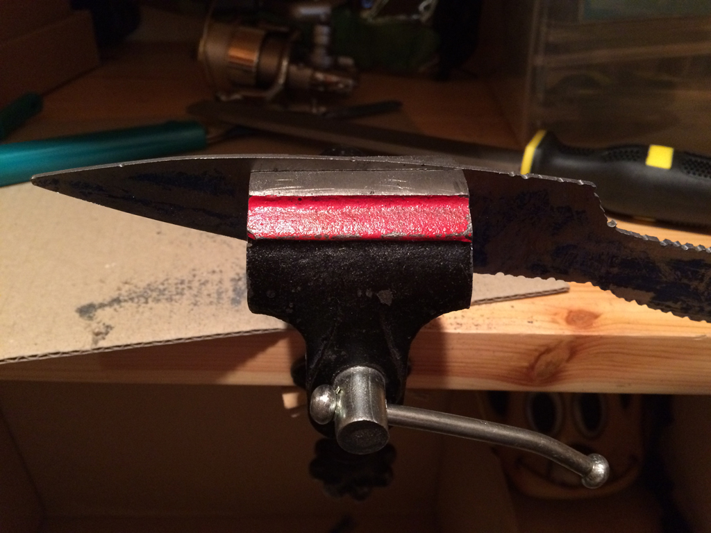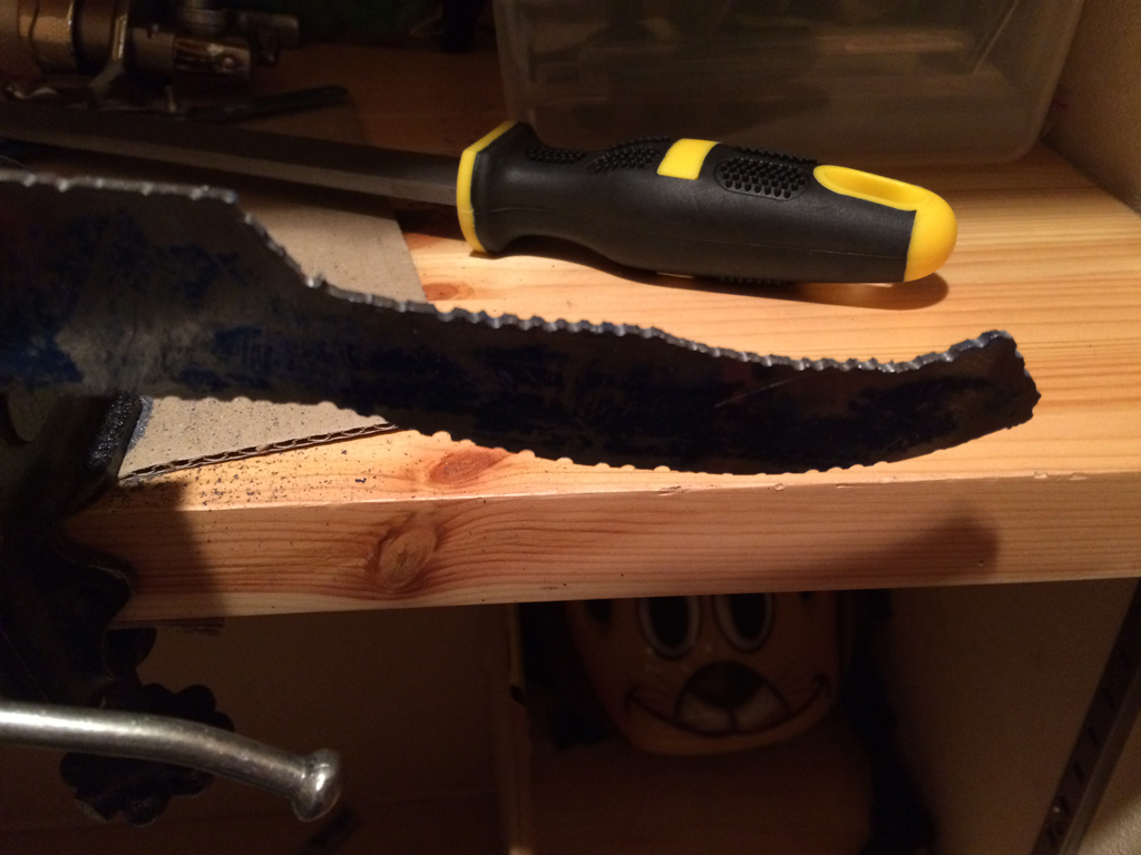 削る前にブレードにはガムテープなどを貼り付けて傷つかないようにマスキングした方が良いですね。焼き入れてあるから後から直すのはヒジョーにしんどいですよ。