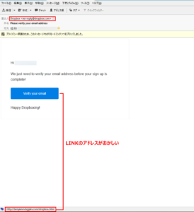 案の定、クリックを求めてる部分のLINKアドレスはDropBoxと何の関係もない宛先っぽい。