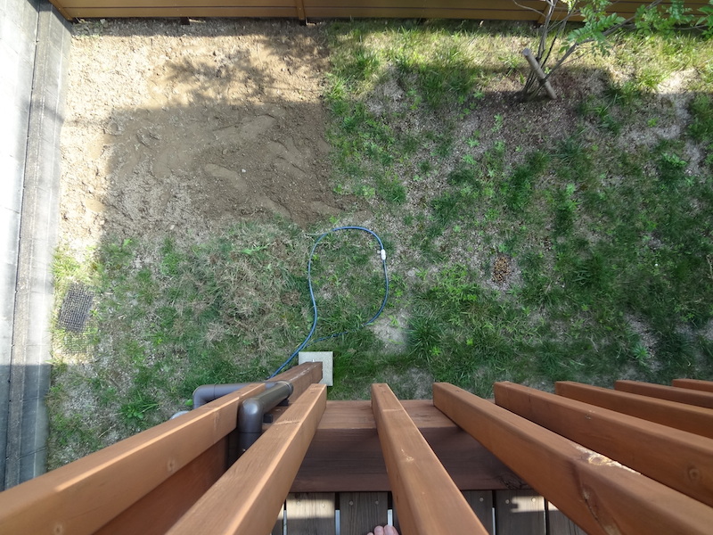 この写真の角に置く予定です。地盤はしっかりしているのだけど芝生やら雑草が生えているので、置く部分をきれいに除草して均さないとだめです。この芝生はDIYショップに売っていた芝生の種を適当に撒いて生やしたんですが、造園屋さんに「コレ芝生じゃないような気がするのですが・・・」と言われてしまいました。私も薄々は感じていたのですが、改めて言われて納得しましたわ。
