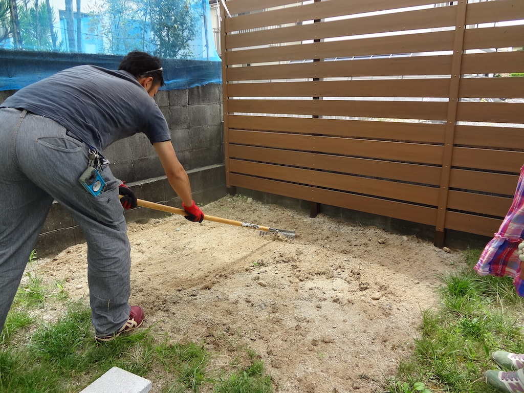 まずは除草したエリアを地均しします