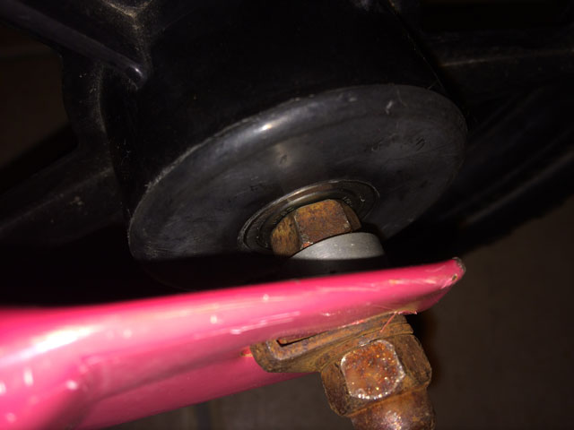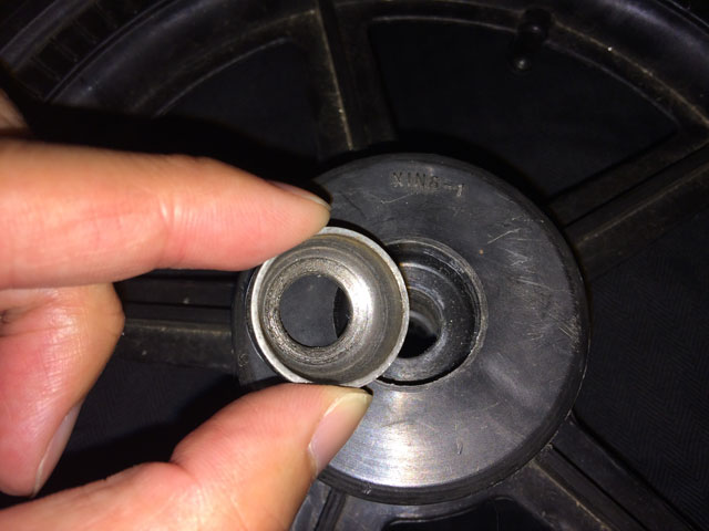 純正のベアリングから交換することで、アームとのクリアランスが変わってしまいます。適当なカラーを突っ込んで調整します。銀色の部分がたまたま家にあったカラーです。無ければホームセンターで売っている径の合った塩ビパイプをカットして突っ込んでもいけそう。