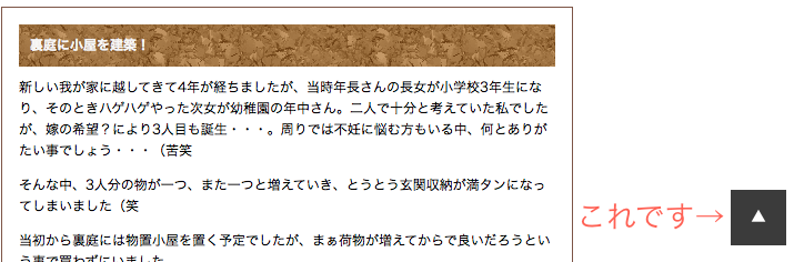 スクロールして記事を読んでいくと自動で出現し、クリックするとヘッダーまで戻ります。スクロールで戻っていくと一定の場所で消えるようにしてあります。